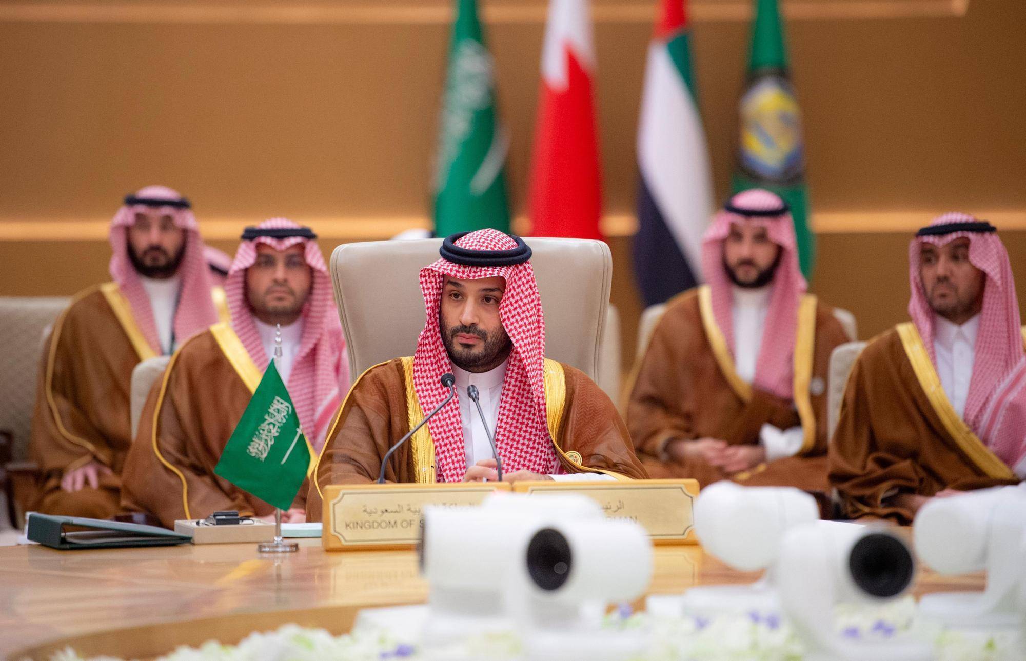 5月14日,在沙特阿拉伯利雅得,沙特王储兼首相穆罕默德(前)在海合会-美国峰会上讲话。新华社发(沙特通讯社供图)曾任美国政府中东地区情报官员的乔纳森·帕尼科夫认为,如果没有巴勒斯坦建国的“可信路径”,穆罕默德王储短期内无意考虑与以色列关系正常化。