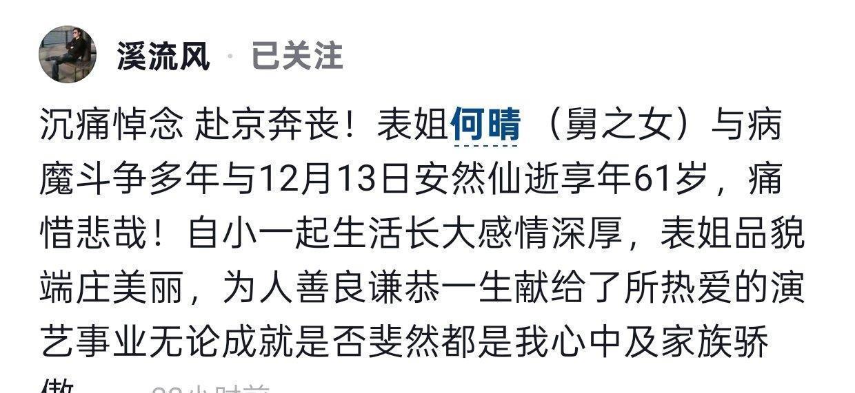 这次手术出了并发症,让她中了风,结果手脚没力气、说话也不利索,完全没法自己走路了,生活上得靠保姆来帮忙照顾。从那以后,何晴的身体越来越差,几乎看不到好转的苗头。到今年情况完全无法控制了,最后在亲朋好友的陪伴中平静地离开了人世。