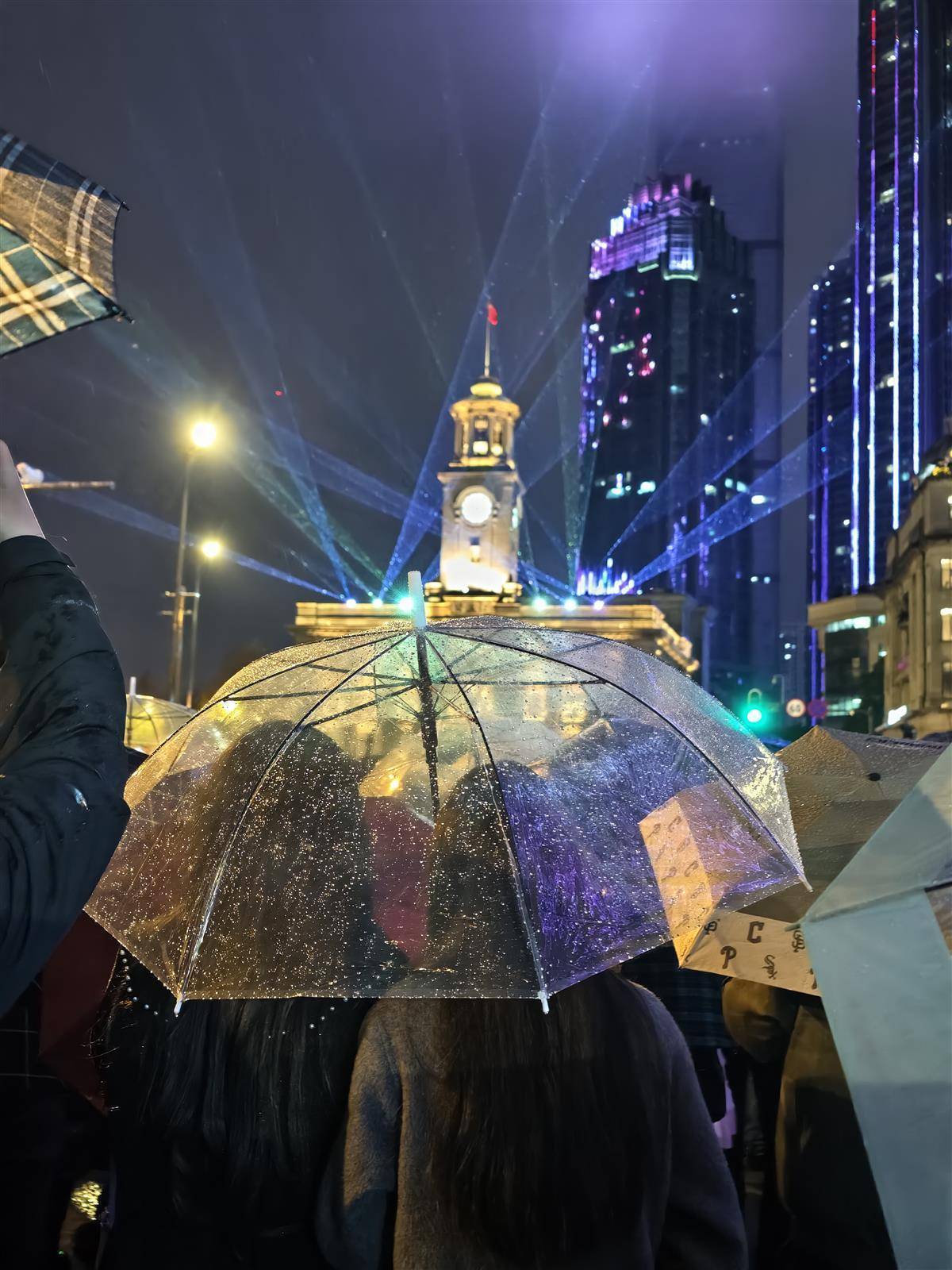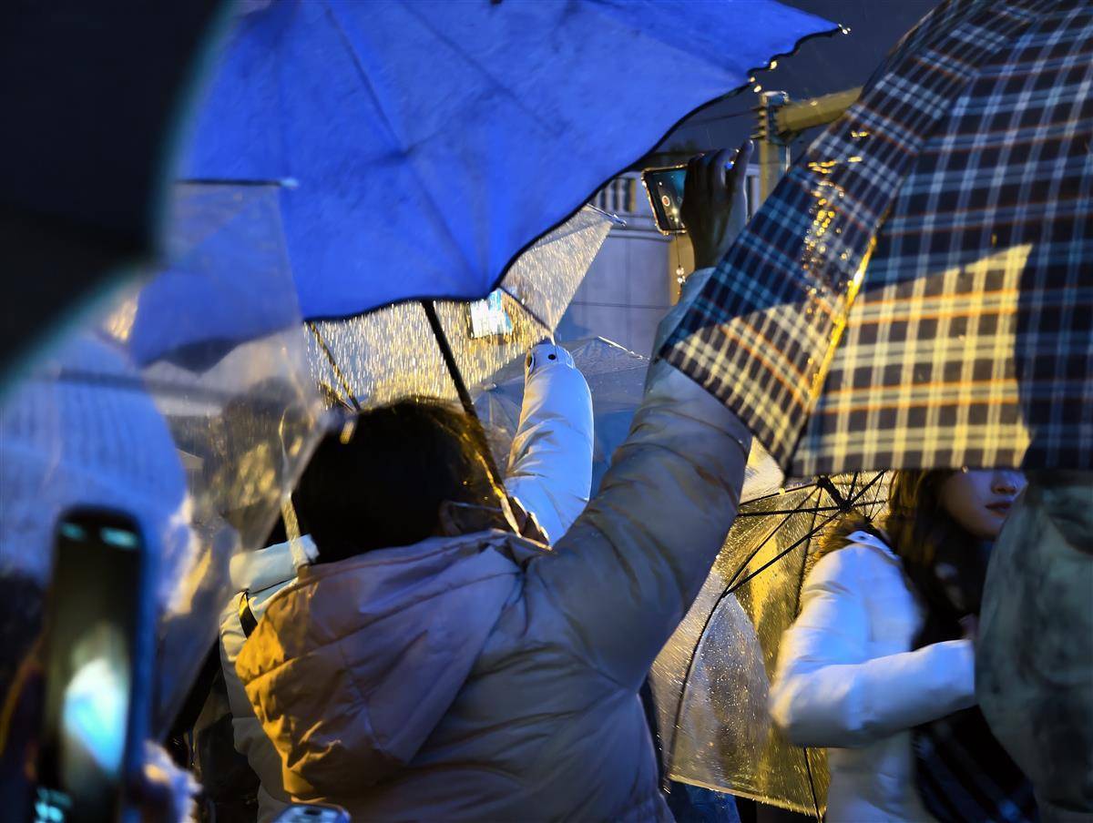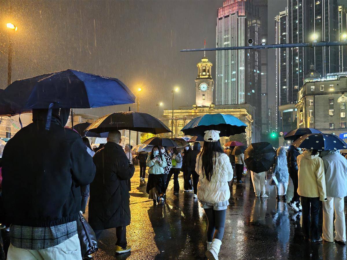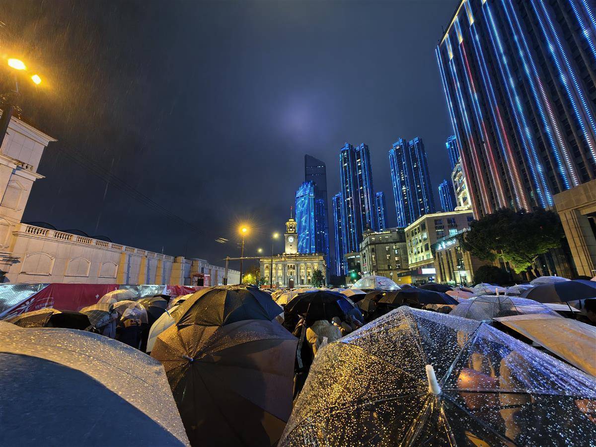 傍晚19时左右,武汉下起小雨,江汉关钟楼前热度不减,行人举着伞等待。