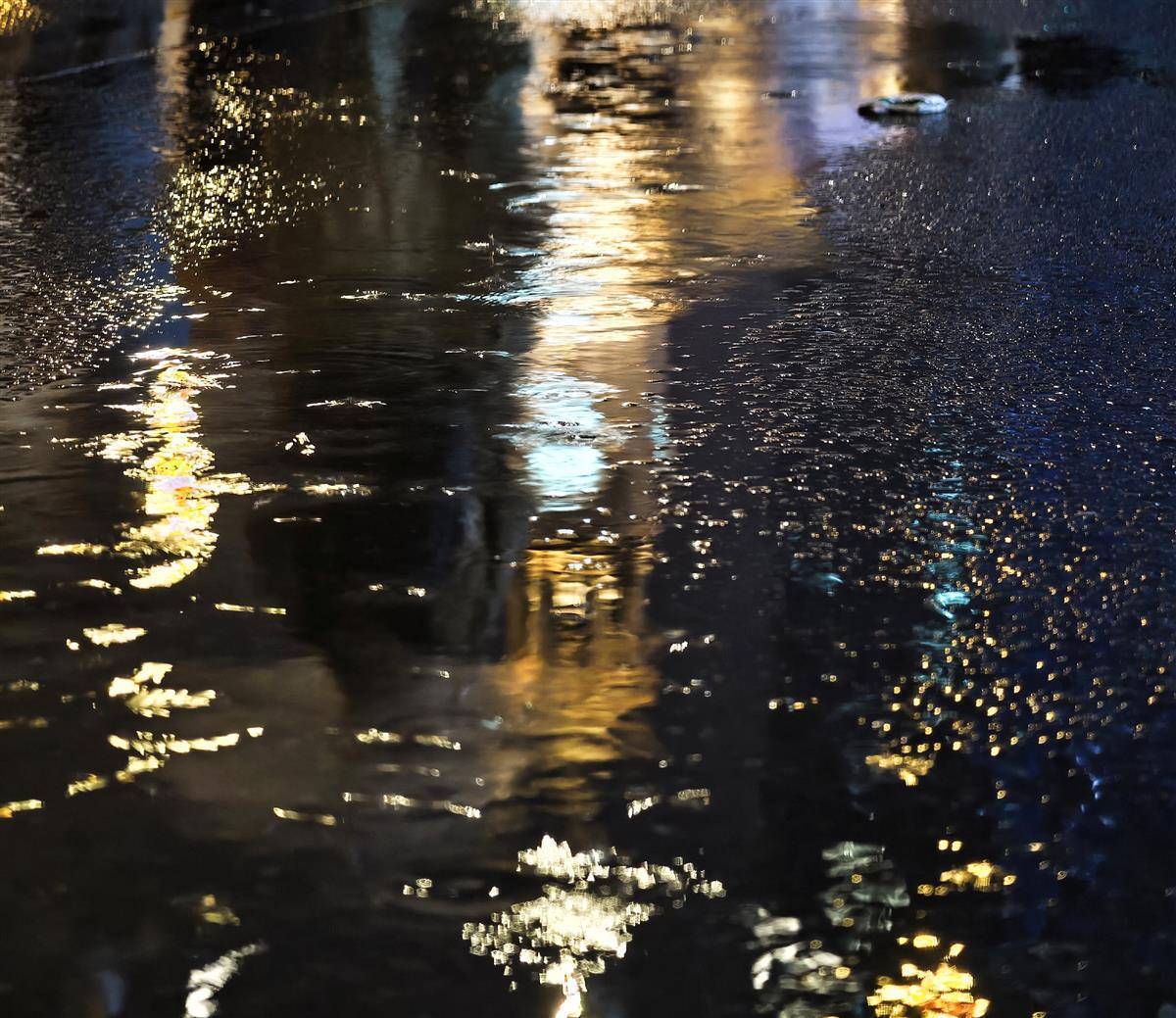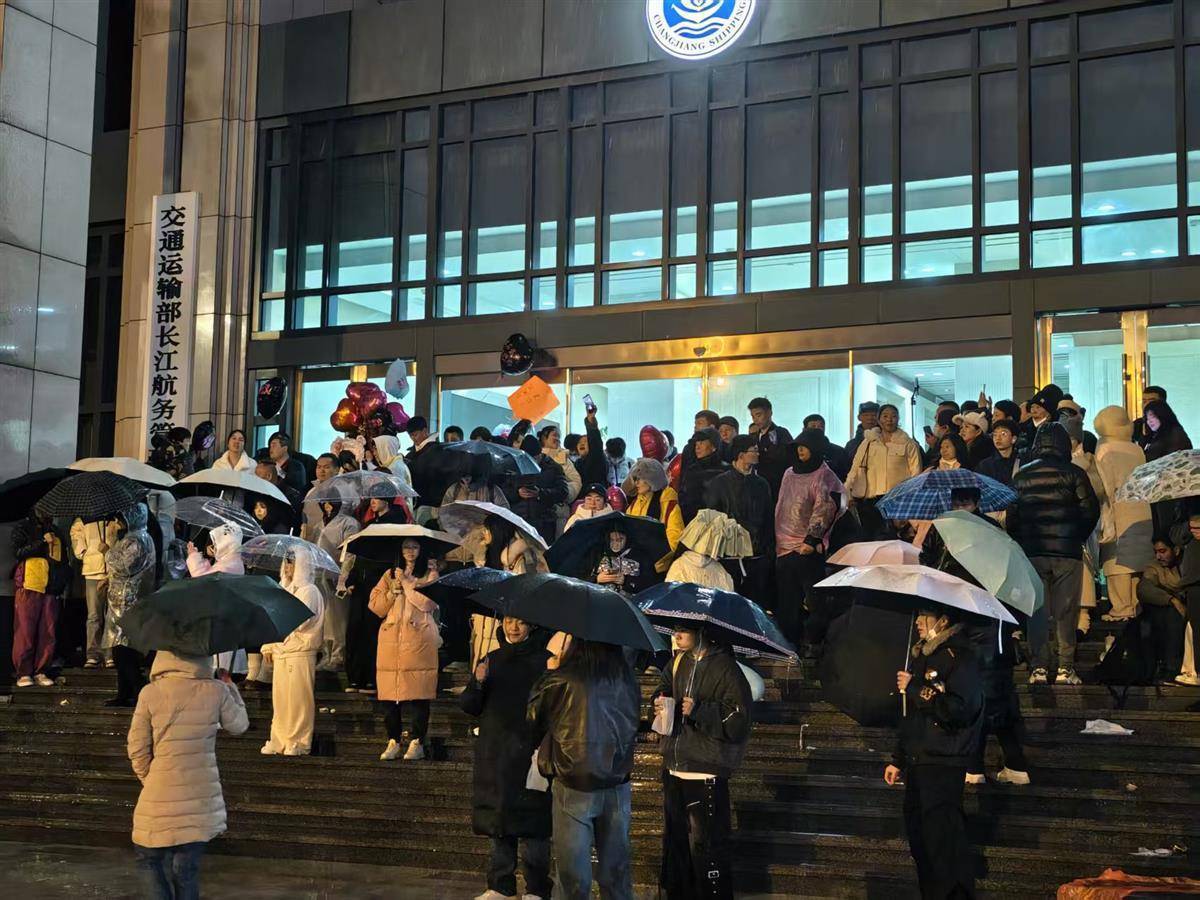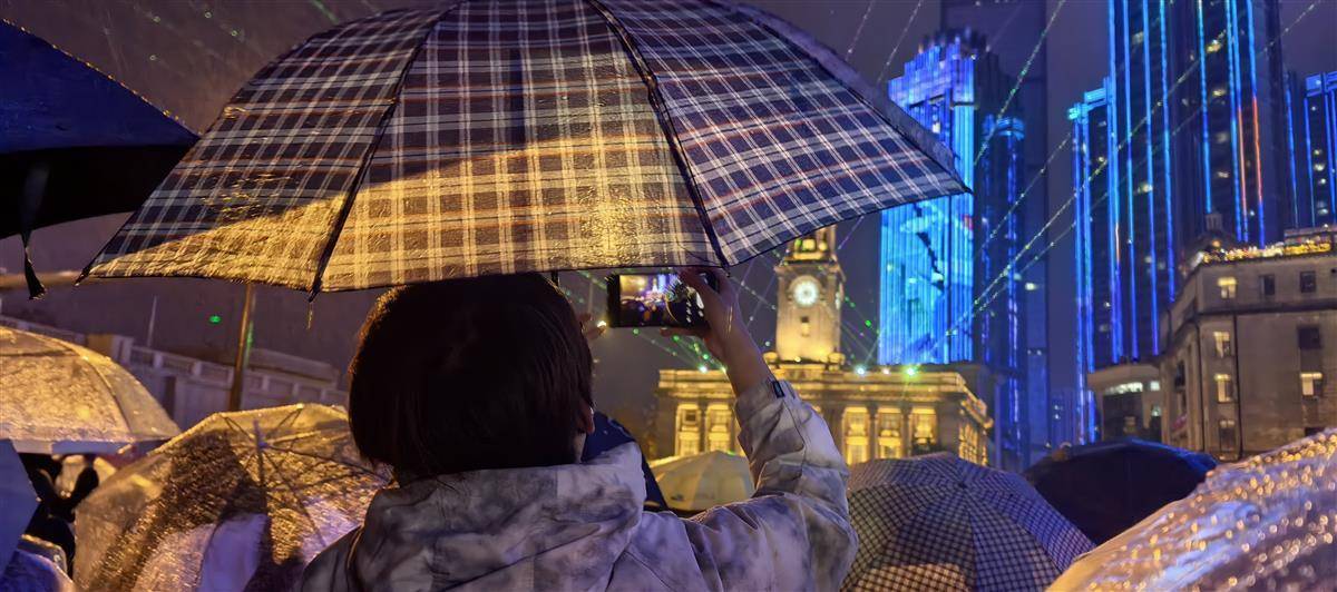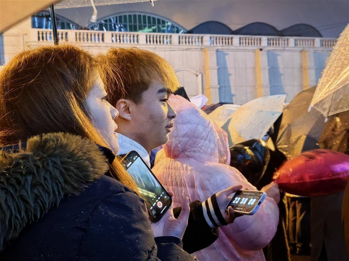傍晚19时左右,武汉下起小雨,江汉关钟楼前热度不减,行人举着伞等待。