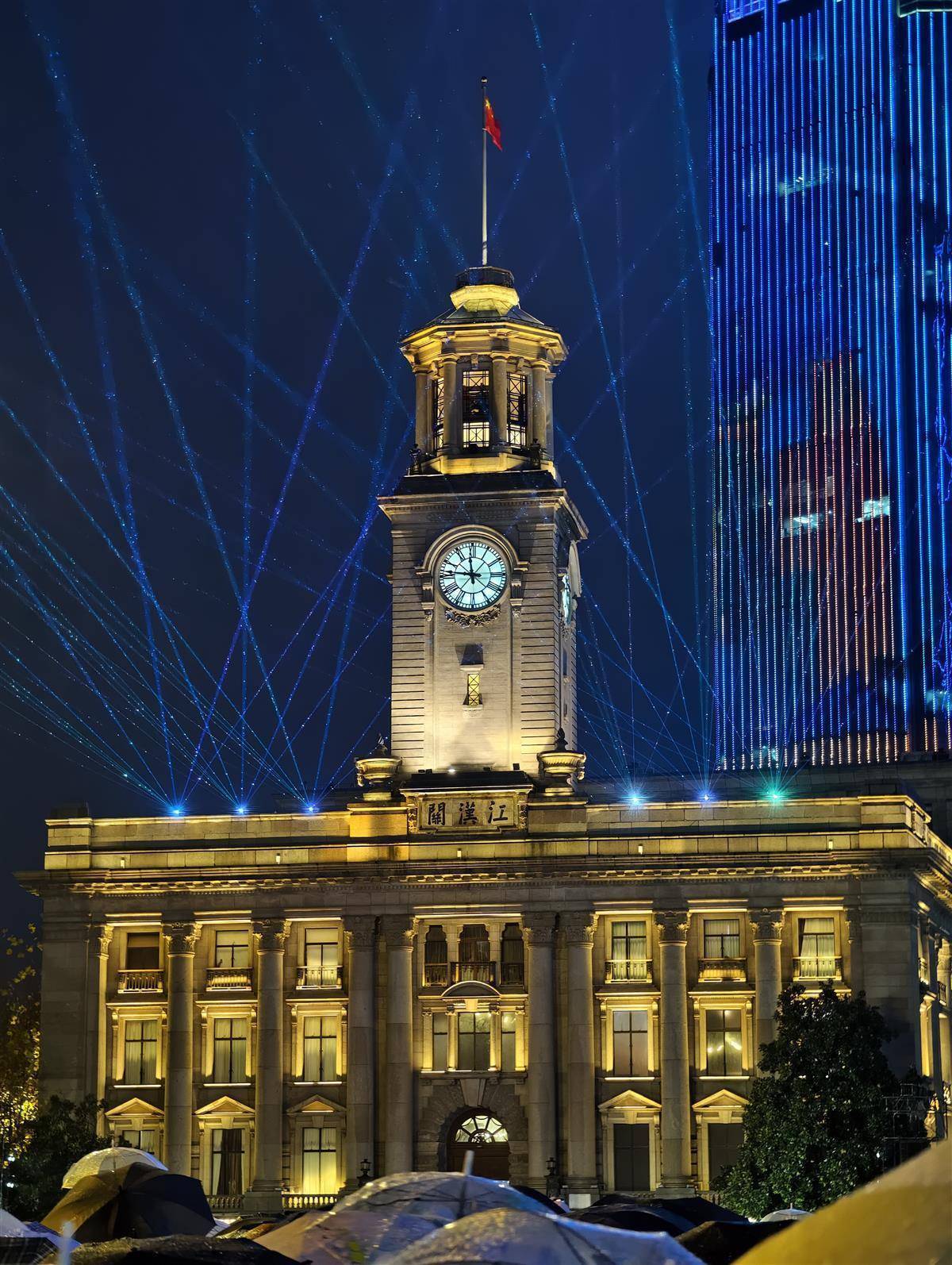 江汉关钟楼前,五颜六色的雨伞汇聚成片。