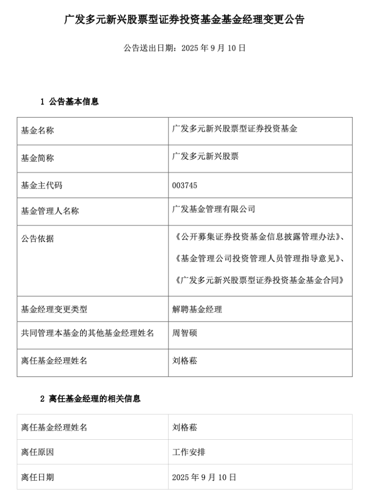 9月10日,广发基金公告称,基金经理刘格菘因工作安排卸任广发多元新兴股票,由此前共同管理该基金的周智硕独自管理。